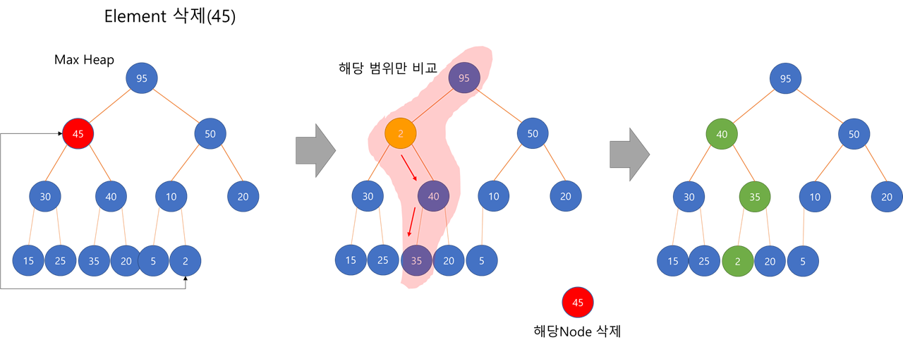 Element를 삭제할 경우, 마지막 Node와 위치 변경 후 해당 해당 Element는 삭제하고,