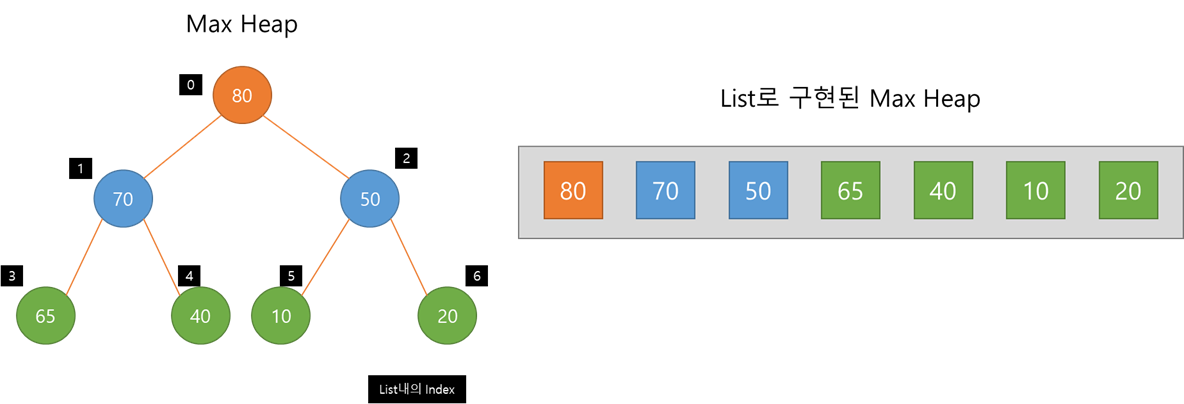 List로 구현할 경우, i번째의 Node는 2i+1, 2i+2번째 노드의 부모Node가 됩니다.