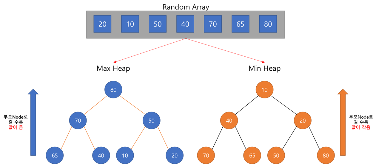 Random한 Array를 Max Heap 또는 Min Heap을 만들었을 경우의 모습입니다. 따로 설명이 필요없어보이네요